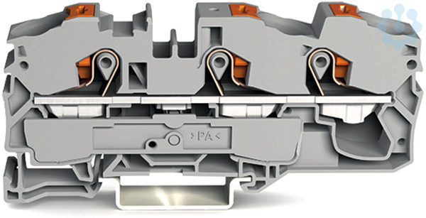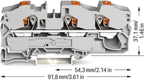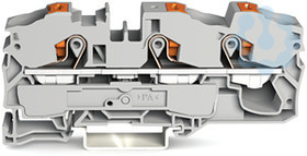 3-Leiter-Durchgangsklemme; mit Drücker; 16 mm²; mit Prüföffnung; seitliche und mittige Beschriftung; für Tragschiene 35 x 15 und 35 x 7,5; Push-in CAGE CLAMP®; 16,00 mm²; grau