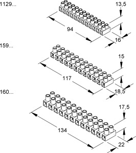 Euro-Klemme nach DIN EN 60998, mit 12 abtrennbaren Klemmstellen, mit Drahtschutz, halogenfrei. Abmessungen (ca. Maße) H x B x L : 15 x 18,5 x 117 mm Klemmbereich eindrähtig, starr, flexibel : 1,5 - 4,0 mm² Werkstoff Isolierteil : PA Werkstoff Klemmbolzen : Messing Werkstoff Klemmschrauben : galvanisch verzinkter Stahl Max. Umgebungstemperatur nach EN 60998 : T85 Nennspannung : 450 V Farbton : natur