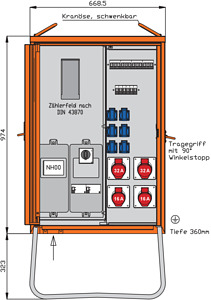 WALTHER AnschlussverteilerschrankAnschlussleistung: 44kVAnach IEC61439-4und DIN/VDE 43868/1Gehäuse (H14) aus elektrolytisch-verzinktem Stahlblech mit schwermetallfreier Kunststoff-Lackierung Farbe: RAL 2004 -reinorange- mit Einfachtür, Federfallriegel für Vorhängeschloss und Griffmulde mit Kranösen und seitlichen Tragegriffen inkl. feuerverzinktem Untergestell mit Ösen für Erdnägel Einbauten bis einschließlich RCD-Schutzschalter im IsolierstoffgehäuseSchutzart: IP 44Messeinrichtung Schutzart: IP 54Größe ca.: 974 x 669 x 360mm / H-B-T + Untergestell-Höhe ca.: 323mmAnschluss:1 NH00-Sicherungslasttrennschalter 80A mit Bügelklemmen 10-50qmmMessung:1 DS-Zählerplatz ohne Zähler nach DIN 43870/2Abgang / Absicherung:1 Leistungsschalter 3P 63A mit thermisch-magnetischem Auslöser1 RCD-Schutzschalter 4P 63A/30mA -B-2 CEE-Anbaudosen 32A 5P 400V 6h mit je 1 Leitungsschutzschalter (MCB) 3P 32A -C-2 CEE-Anbaudosen 16A 5P 400V 6h mit je 1 Leitungsschutzschalter (MCB) 3P 16A -C-1 RCD-Schutzschalter 4P 40A/30mA -A-6 Schutzkontaktsteckdosen 16A 2P 230V mit je 1 Leitungsschutzschalter (MCB) 1P 16A -C-