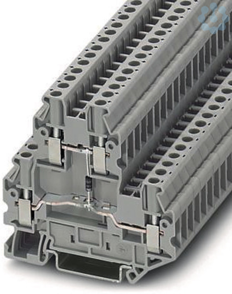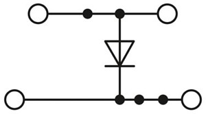 Bauelementreihenklemme, Der max. Strom wird durch die Diode bestimmt. Eingebaut: Diode 1N 4007, Sperrspannung: 1300 V, Dauergrenzstrom: 0,5 A., mit integrierter Diode, Nennstrom: 0,5 A, Anschlussart: Schraubanschluss, 1. und 2. Etage, Bemessungsquerschnitt: 2,5 mm², Querschnitt: 0,14 mm² - 4 mm², Montageart: NS 35/7,5, NS 35/15, Farbe: grau