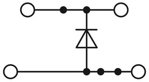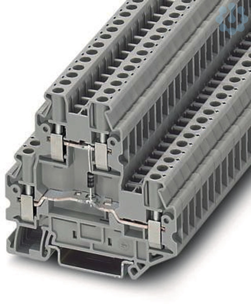 Bauelementreihenklemme, Der max. Strom wird durch die Diode bestimmt. Eingebaut: Diode 1N 4007, Sperrspannung: 1300 V, Dauergrenzstrom: 0,5 A., mit integrierter Diode, Nennstrom: 0,5 A, Anschlussart: Schraubanschluss, 1. und 2. Etage, Bemessungsquerschnitt: 2,5 mm², Querschnitt: 0,14 mm² - 4 mm², Montageart: NS 35/7,5, NS 35/15, Farbe: grau