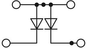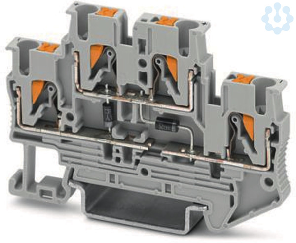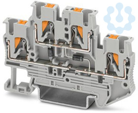 Bauelementreihenklemme, mit integrierter Diode 1N4007, Nennstrom: 0,5 A, Anzahl der Anschlüsse: 4, Anschlussart: Push-in-Anschluss, Bemessungsquerschnitt: 2,5 mm², 1. und 2. Etage, Querschnitt: 0,14 mm² - 4 mm², Montageart: NS 35/7,5, NS 35/15, Farbe: grau