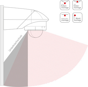 Zusätzlich verfügt der Bewegungsmelder über einen Unterkriechschutz mit einem Radius von 1 Meter, um auch Bewegungen in unmittelbarer Nähe zu erfassen. Die Ausschaltverzögerung ist einstellbar und kann von 3 Sekunden bis zu 20 Minuten variiert werden, was eine flexible Anpassung an individuelle Anforderungen ermöglicht.