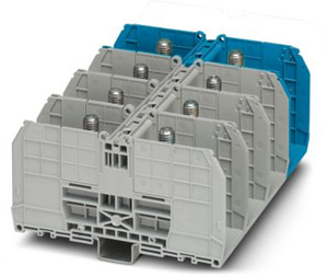 Bolzenanschlussklemme, Nennspannung: 1000 V, Nennstrom: 520 A, Anzahl der Anschlüsse: 8, Polzahl: 4, Anschlussart: Bolzenanschluss, Bemessungsquerschnitt: 300 mm², Montageart: NS 35/7,5, NS 35/15, direktes Anschrauben, Farbe: grau/blau