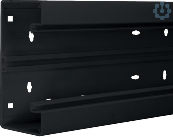 Brüstungskanal-Unterteil aus PVC in Graphitschwarz, Maße: 68x170mm, Oberteilbreite 80mm. Konform mit DIN EN 50085-1, geeignet für den Einbau handelsüblicher Geräte. Features: Bodenlochung für Wandmontage, Rechtecklochung für clipbasierte Montage auf Konsolen, C-Profil für erweiterte Geräteeinbaumöglichkeiten. Kupplungen, Trennwände und Leitungsrückhalteklammern als Zubehör verfügbar.