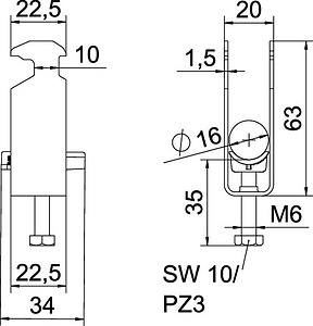 Bügelschelle mit Hammerkopf-Fuß, Kunststoffdruckwanne aus Polypropylen. Zur vertikalen und horizontalen Montage von 2 Einzelkabeln an C-Profilschiene. Für Schlitzweite 16 - 17 mm. Mit 1-gängiger Schraube an Druckwanne, universeller Sechskant-Schraubenkopf SW10, mit Schlitz und Kreuzschlitz. Geeignet für Montage im Innen- und Außenbereich. Mehrere Kabel sollten durch Doppelwannen getrennt werden. Der Einsatz einer Gegenwanne wird empfohlen.