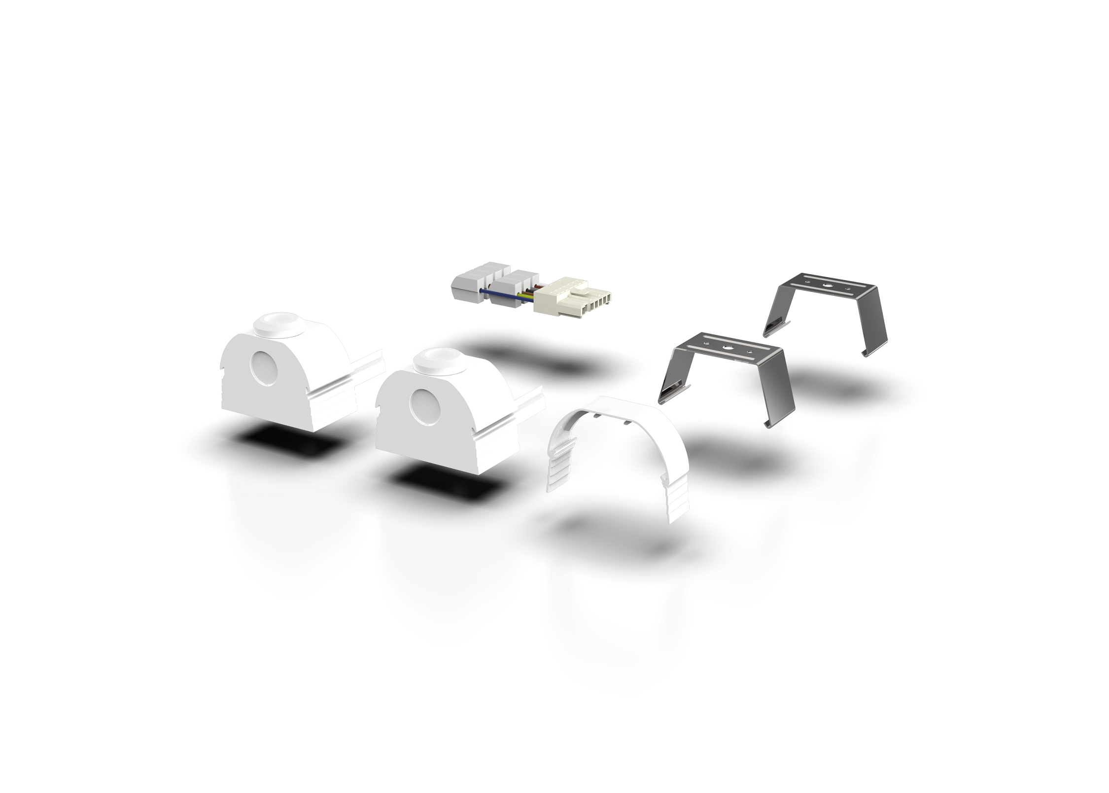 Anschlussset für ClickLUX ROCKET Lichtbandsystem. Enthält 1x Anschlussstecker mit Klemmen, 2x Endkappe, 2x Abhänger, 1x Dichtclip.