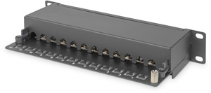 CAT 6, Klasse E Patch Panel, geschi., 12-Port RJ45 8P8C, LSA, 1HE, 254mm(10")Rack Mount, sw RAL 9005