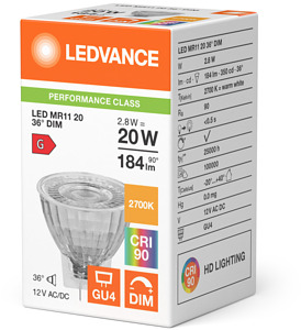 Dimmbare Niedervolt-LED-Reflektorlampen MR11 mit Retrofit-Stecksockel. Produkteigenschaften: LED-Alternative zu Niedervolthalogenlampen. Hohe Farbkonsistenz: ≤ 6 SDCM (Schwellwerteinheit). Dimmbar. Sockel: G4. Lampe aus Glas. Sehr hohe Farbwiedergabe (Ra: 90). Lebensdauer bis zu 25.000 h. Produktvorteile: Einfacher, schneller und sicherer Lampenaustausch ohne Umverdrahtung. Design, Abmessungen, Lichtstrom vergleichbar mit einer Glüh- oder Halogenlampe. Geringer Wartungsaufwand durch lange Lebensdauer. Keine UV- und IR-nahen Anteile im Lichtstrahl. Stufenloses Dimmen. Sehr hohe Dimmerkompatibilität, siehe auch www.ledvance.de/dim. Kompatibel mit vielen handelsüblichen elektronischen Vorschaltgeräten (siehe auch Kompatibilitätsliste). Sofort 100 % Licht, keine Aufwärmzeit. Geringerer Energieverbrauch als Glüh- oder Halogenlampen. Anwendungsgebiete: Verkaufs- und Ausstellungsräume. Anwendungen im Haushalt. Anwendung im Gewerbe. Akzentbeleuchtung. Einsatz im Außenbereich nur in geeigneten Außenleuchten. Sicherheitshinweise: Lampe nicht berühren, wenn sie beschädigt ist.. Betrieb mit defektem Außenkolben nicht zulässig..