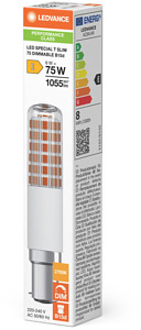 Dimmbare schlanke LED-Lampen. Produkteigenschaften: Dimmbar (an vielen handelsüblichen Dimmern, siehe auch www.ledvance.de/dim). LED-Alternative zu konventionellen Hochvoltlampen. Gute Lichtqualität; Farbwiedergabeindex Ra: ≥ 80; konstanter Farbort. Produktvorteile: Einfacher Ersatz von Halogenlampen dank kompaktem Design. Insbesondere in vielen kleinen Designerleuchten einsetzbar. Geringere Wärmeentwicklung (gegenüber dem Standardreferenzprodukt). Drei Jahre Garantie. Geringerer Energieverbrauch als Glüh- oder Halogenlampen. Anwendungsgebiete: Kleine Designerleuchten. Überall wo kompakte, effiziente Lampen benötigt werden. Einsatz im Außenbereich nur in geeigneten Außenleuchten. Sicherheitshinweise: Lampe nicht berühren, wenn sie beschädigt ist. Betrieb mit defektem Außenkolben nicht zulässig. Um die volle Lichteffizienz und Produktlebensdauer sicherzustellen, wird empfohlen Glas oder Abdeckung der Leuchte zu entfernen.