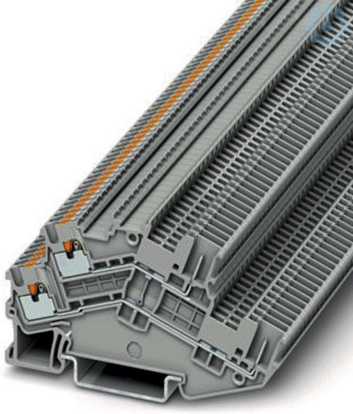 Doppelstockklemme, Strom und Spannung werden durch den eingesetzten Stecker bestimmt., Nennspannung: 500 V, Nennstrom: 16 A, Anschlussart: Push-in- / Steckanschluss, 1. und 2. Etage, Bemessungsquerschnitt: 1,5 mm², Querschnitt: 0,14 mm² - 1,5 mm², Montageart: NS 35/7,5, NS 35/15, Farbe: grau