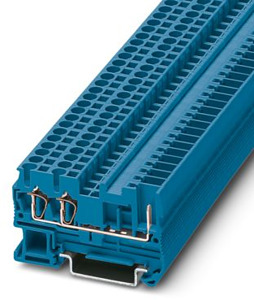 Durchgangsklemme, Nennspannung: 500 V, Nennstrom: 24 A, Anzahl der Anschlüsse: 3, Polzahl: 1, Anschlussart: Zugfeder- / Steckanschluss, Bemessungsquerschnitt: 2,5 mm², 1. Etage Anschluss links, Querschnitt: 0,08 mm² - 4 mm², 1. Etage Anschluss rechts, Montageart: NS 35/7,5, NS 35/15, Farbe: blau