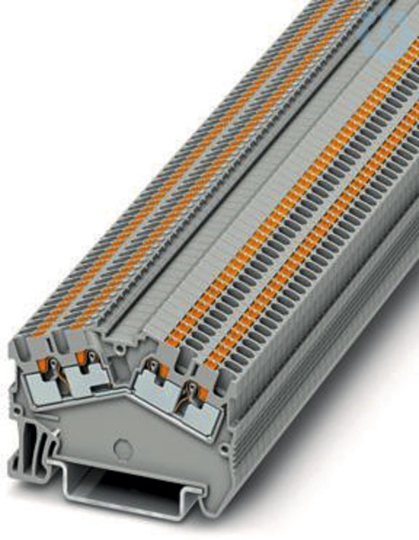 Durchgangsklemme, Nennspannung: 500 V, Nennstrom: 17,5 A, Anzahl der Anschlüsse: 4, Anschlussart: Push-in-Anschluss, Bemessungsquerschnitt: 1,5 mm², 1. Etage, Querschnitt: 0,14 mm² - 1,5 mm², Montageart: NS 35/7,5, NS 35/15, Farbe: grau