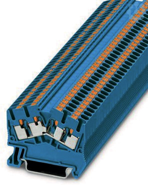 Durchgangsklemme, Nennspannung: 800 V, Nennstrom: 24 A, Anzahl der Anschlüsse: 4, Anschlussart: Push-in-Anschluss, Bemessungsquerschnitt: 2,5 mm², 1. Etage, Querschnitt: 0,14 mm² - 4 mm², Montageart: NS 35/7,5, NS 35/15, Farbe: blau