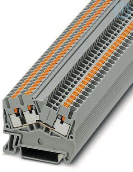 Durchgangsklemme, Nennspannung: 800 V, Nennstrom: 24 A, Anzahl der Anschlüsse: 3, Anschlussart: Push-in-Anschluss, Bemessungsquerschnitt: 2,5 mm², 1. Etage, Querschnitt: 0,14 mm² - 4 mm², Montageart: NS 35/7,5, NS 35/15, Farbe: grau