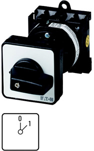 EIN-AUS-Schalter, Sortiment: Steuerschalter, Normen und Bestimmungen: IEC/EN 60947, VDE 0660, IEC/EN 60204, CSA, UL, Lasttrennschalter nach IEC/EN 60947-3, Typkenner: T0, mit schwarzem Knebel und Frontschild, Kontakte: 1, Schutzart: Front IP65, Bauform: rückseitiger Einbau, Schaltwinkel: 45 °, Schaltverhalten: rastend, mit 0-Stellung, 1 Baueinheit(en), Bemessungsdauerstrom: Iu= 20 A, Frontschild: 0-1
