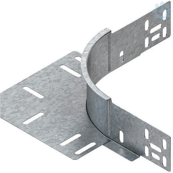 Eckanbaustück, mit ungelochtem Seitenholm, mit Verbinderlochung für den Anschluss, mit durchgängiger Kabelauflage durch überlappendes Bodenblech, für Kabelrinnen, zur Herstellung von horizontalen 90° Eck- und T-Verbindungen, breitenunabhängiges Bauteil, mit integrierten Stoßstellenverbindern, einschließlich anteilmäßigem Befestigungszubehör. Zur Verwendung im Funktionserhalt bitte Zusatzvorschriften beachten! für Kabelrinnen : 60 mm Kantenhöhe Abmessungen (ca. Maße) innen H : 60 mm Innenholmradius R : 99 mm Werkstoff : Stahl, bandverzinkt nach DIN EN 10346