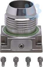 Einbauadapter für optische Füllstandsensoren; 42 x 43,5 x 42 mm; Flansch: 1.4404 (Edelstahl / 316L); Dichtung: FKM; Abdeckscheibe: PMMA transparent; Schrauben: Edelstahl; Unterlegscheiben: Edelstahl