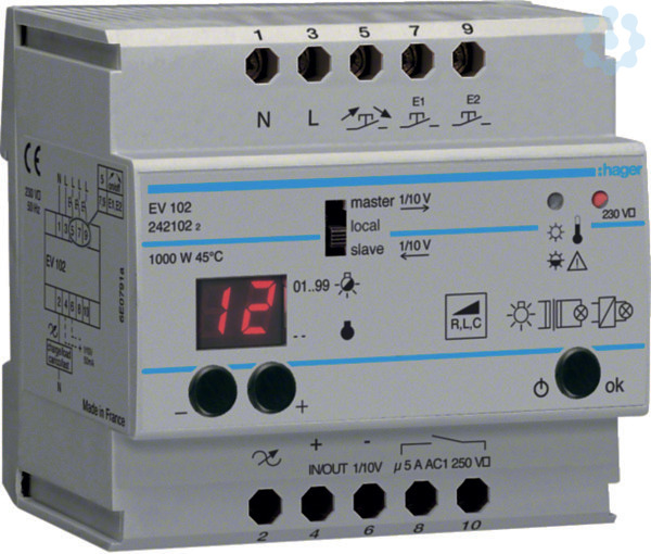 Ferndimmer universal 1000W Komfort.Ferndimmer, universal mit automatischer Erkennung des Lasttypes. Anzeige des eingestellten Helligkeitwertes über Display am Gerät. Zur Ansteuerung von Glühlampen, 230V-Halogenlampen und Niedervolt-Halogenlampen mit elektronischen oder gewickelten Transformatoren. Fernbedienung des Dimmers durch Taster (auch beleuchtet: Ruhestandstrom bis 5 mA). Zusätzliche Handbedienung am Dimmer. Steuerschnittstelle 1-10 V als Master (Ausgang) oder Slave (Eingang) einstellbar. Ein Schaltausgang zur Zustandsanzeige (Dimmausgang 0V -- geschlossen). Abruf von bis zu 3 voreinstellbaren Helligkeiten über separate am Gerät anschließbare Kontakte. Dimmgeschwindigkeiten, abrufbare Helligkeiten, minimaler und maximaler Helligkeitswert über Display einstellbar. Speicherung der Dimmstellung beim Ausschalten oder bei Netzausfall. Integrierte Sicherung gegen Lastkurzschluss und elektronischer Übertemperaturschutz mit automatischer Leistungsbegrenzung, selbstrückstellend.