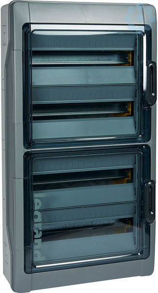 Legrand Feuchtraumverteiler Plexo³, Schutzart IP65 - IK09, 4-reihig, 72 Module (18 Module/Reihe), Abmessung 822 x 448 x 161 (Höhe x Breite x Tiefe in mm), selbstverlöschend 650 °C, mit N- und PE-Klemmen, Aufputzverteiler Schutzklasse II. Türen transparent, beidseitig anschlagbar. Nach EN 62208, für den Bau von Installationsverteilern nach EN 61439-3.