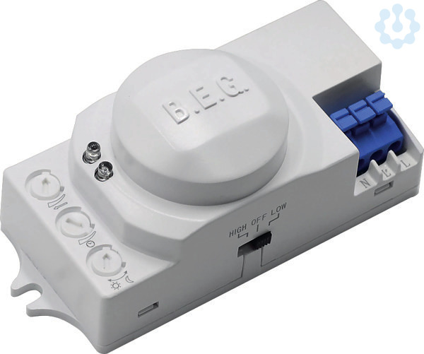 Hochfrequenz-Bewegungsmelder, für Unterputzeinbau und Einbau in Leuchten, Temperaturunabhängige Detektion, Detektion durch diverse Materialien möglich, Reichweite, Einschaltschwelle und Nachlaufzeit über Potentiometer einstellbar