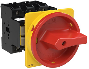 Hauptschalter, P3, 63 A, Zwischenbau, 3-polig, 1 S, 1 Ö, NOT-AUS-Funktion, roter Drehgriff, gelber Sperrkranz