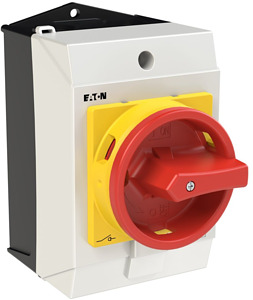 Hauptschalter, Sortiment: Hauptschalter, Wartungsschalter, Reparaturschalter, Typkenner: T0, STOPP-Funktion: NOT-AUS-Funktion, mit rotem Drehgriff und gelbem Sperrkranz, 3-polig, Abschließbarkeit: abschließbar in 0-Stellung, Schutzart: IP65, Bauform: Aufbau, Schaltwinkel: 90 °, Bemessungsbetriebsleistung AC-23A, 50 - 60 Hz 400 V: P = 5.5 kW, Bemessungsdauerstrom: Iu = 20 A, 2 Baueinheit(en), Normen und Bestimmungen: IEC/EN 60947, VDE 0660, IEC/EN 60204, Lasttrennschalter nach IEC/EN 60947-3