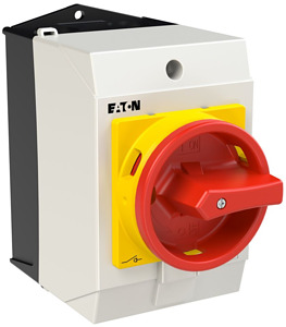 Hauptschalter, Sortiment: Hauptschalter, Wartungsschalter, Reparaturschalter, Typkenner: T0, Stopp-Funktion: NOT-AUS-Funktion, mit rotem Drehgriff und gelbem Sperrkranz, 6-polig, Verriegelungsvorrichtung: In der Position 0 (Aus) verriegelbar, Schutzart: IP65, Bauform: Oberflächenmontage, Schaltwinkel: 90 °, Bemessungsbetriebsleistung AC-23A, 50 - 60 Hz 400 V: P = 5,5 kW, Bemessungsdauerstrom: Iu = 20 A, 3 Baueinheit(en), Normen und Bestimmungen: IEC/EN 60947, VDE 0660, IEC/EN 60204, Lasttrennschalter nach IEC/EN 60947-3