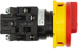 Hauptschalter, T0, 20 A, Einbau, 2 Baueinheit(en), 3-polig, NOT-AUS-Funktion, mit rotem Drehgriff und gelbem Sperrkranz, abschließbar in 0-Stellung