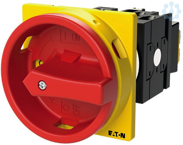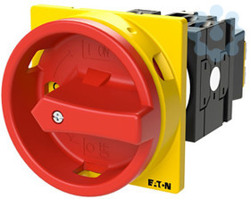 Hauptschalter, T0, 20 A, Einbau, 3 Baueinheit(en), 3-polig, 1 S, 1 Ö, NOT-AUS-Funktion, roter Drehgriff, gelber Sperrkranz