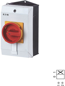 Hauptschalter, Sortiment: Hauptschalter, Wartungsschalter, Reparaturschalter, Typkenner: T3, Stopp-Funktion: NOT-AUS-Funktion, mit rotem Drehgriff und gelbem Sperrkranz, 1-polig, Verriegelungsvorrichtung: In der Position 0 (Aus) verriegelbar, Schutzart: IP65, Bauform: Oberflächenmontage, Schaltwinkel: 90 °, Bemessungsbetriebsleistung AC-23A, 50 - 60 Hz 400 V: P = 15 kW, Bemessungsdauerstrom: Iu = 32 A, 1 Baueinheit(en), Normen und Bestimmungen: IEC/EN 60947, VDE 0660, IEC/EN 60204, Lasttrennschalter nach IEC/EN 60947-3