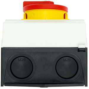 Hauptschalter, Sortiment: Hauptschalter, Wartungsschalter, Reparaturschalter, Typkenner: T3, Stopp-Funktion: NOT-AUS-Funktion, mit rotem Drehgriff und gelbem Sperrkranz, 3-polig + N, Verriegelungsvorrichtung: In der Position 0 (Aus) verriegelbar, Schutzart: IP65, Bauform: Oberflächenmontage, Schaltwinkel: 90 °, Bemessungsbetriebsleistung AC-23A, 50 - 60 Hz 400 V: P = 15 kW, Bemessungsdauerstrom: Iu = 32 A, 3 Baueinheit(en), Normen und Bestimmungen: IEC/EN 60947, VDE 0660, IEC/EN 60204, Lasttrennschalter nach IEC/EN 60947-3