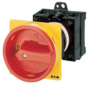Hauptschalter, Sortiment: Hauptschalter, Wartungsschalter, Reparaturschalter, Typkenner: T3, Stopp-Funktion: NOT-AUS-Funktion, mit rotem Drehgriff und gelbem Sperrkranz, 6-polig, Schutzart: Front IP65, Bauform: rückseitiger Einbau, Schaltwinkel: 90 °, Bemessungsbetriebsleistung AC-23A, 50 - 60 Hz 400 V: P = 15 kW, Bemessungsdauerstrom: Iu = 32 A, 4 Baueinheit(en), Normen und Bestimmungen: IEC/EN 60947, VDE 0660, IEC/EN 60204, CSA, UL, Lasttrennschalter nach IEC/EN 60947-3