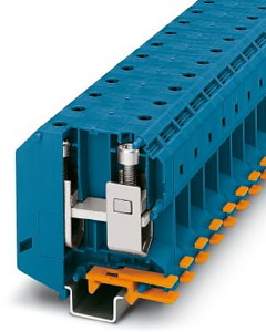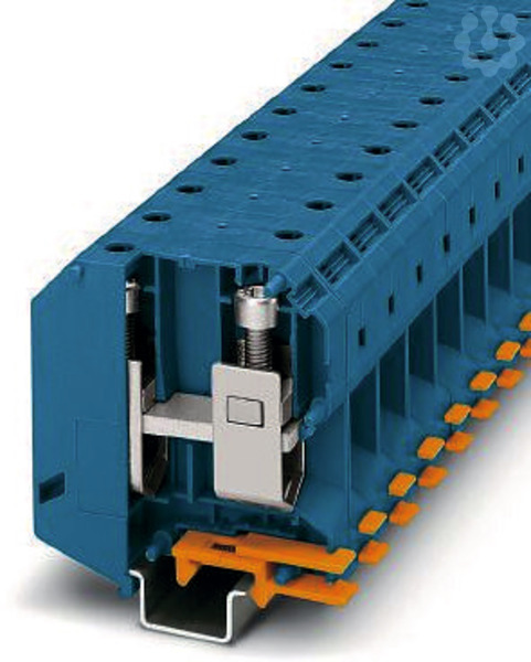 Hochstromklemme, Nennspannung: 1000 V, Nennstrom: 232 A, Anzahl der Anschlüsse: 2, Polzahl: 1, Anschlussart: Schraubanschluss, Bemessungsquerschnitt: 95 mm², Querschnitt: 25 mm² - 95 mm², Montageart: NS 35/15, NS 32, NS 35/15-2,3, Farbe: blau