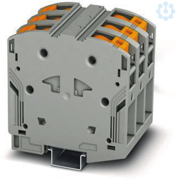 Hochstromklemme, geblockt, Nennspannung: 1000 V, Nennstrom: 150 A, Anzahl der Anschlüsse: 6, Polzahl: 3, Anschlussart: PowerTurn-Anschluss, 1. Etage, Querschnitt: 10 mm² - 70 mm², Montageart: NS 35/15, Farbe: grau