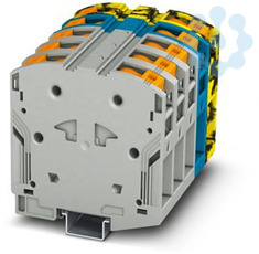 Hochstromklemme, geblockt, Nennspannung: 1000 V, Nennstrom: 150 A, Anzahl der Anschlüsse: 10, Polzahl: 5, Anschlussart: PowerTurn-Anschluss, 1. Etage, Querschnitt: 10 mm² - 70 mm², Montageart: NS 35/15, Farbe: grau/blau/schwarz-gelb
