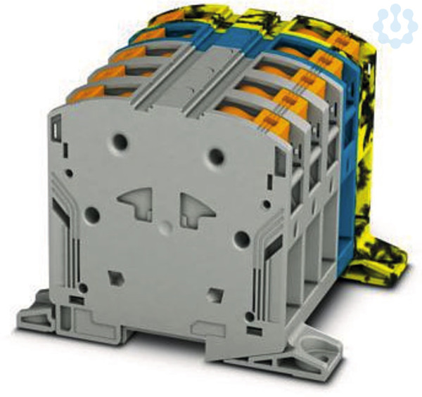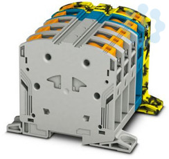Hochstromklemme, geblockt, Nennspannung: 1000 V, Nennstrom: 232 A, Anzahl der Anschlüsse: 10, Polzahl: 5, Anschlussart: PowerTurn-Anschluss, Querschnitt: 25 mm² - 95 mm², Montageart: direktes Anschrauben, Farbe: grau/blau/schwarz-gelb