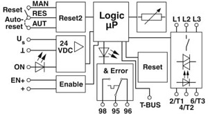 Hybrid-Motorstarter als Alternative zur klassischen Schützschaltung. Startet 3~ AC-Motoren bis 9 A, bietet Motorschutz und Not-Halt bis SIL 3 / PL e. Mögliche Gruppenabschaltung, Versorgung und Relaiserweiterung über Tragschienen-Busverbinder.