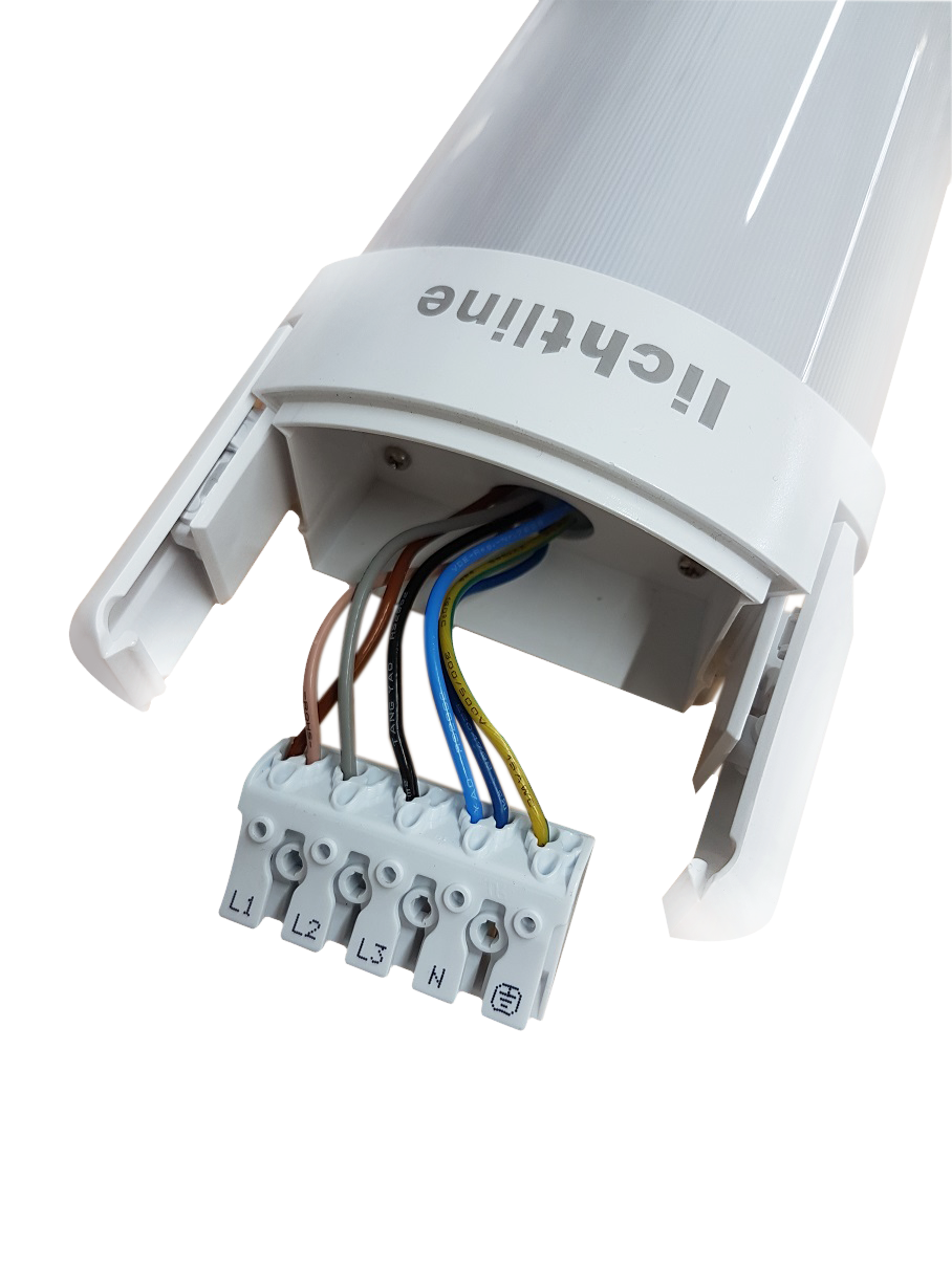 LED-Feuchtraumleuchte mit Durchgangsverdrahtung für den Innen- und Außenbereich. Einfache, schnelle Montage an Wand oder Decke. Befestigungsklammern mit Schraube zur Diebstahlsicherung liegen bei. Befestigung möglich über die komplette Leuchtenlänge. Vorhandene Bohrlöcher können zur Montage verwendet werden. Die Leistung des integrierten Vorschaltgerätes ist mit einem DIP-Schalter reduzierbar (100%, 75%, 50%). Die glatte Oberfläche hat eine geringe Verschmutzungsneigung und ist leicht zu reinigen. Die Leuchte ist staubdicht, geschützt gegen Strahlwasser, schlagfest bis 5J und geeignet für den geschützten Außenbereich. Druckausgleichselement zum Schutz vor Kondenswasserbildung bei Temperatur- und Druckschwankungen. Lange Lebensdauer, hoher Lichtstrom, gute Farbwiedergabe, breit strahlend, flickerfrei. Besonders gleichmäßige Lichtverteilung durch die prismatische PC-Abdeckung. Geringer Wartungsaufwand. Energieeinsparung bis zu 60% gegenüber einer herkömmlichen Feuchtraumleuchte. Bruchsicher, geeignet für den Einsatz in IFS-zertifizierten Bereichen.