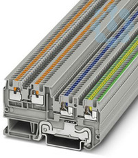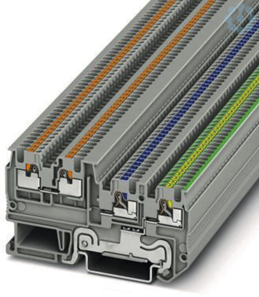 Initiatoren-/Aktorenklemme, mit Schutzleiterfunktion, Nennspannung: 250 V, Nennstrom: 13,5 A, Anzahl der Anschlüsse: 4, Anschlussart: Push-in-Anschluss, Bemessungsquerschnitt: 1,5 mm², Querschnitt: 0,14 mm² - 1,5 mm², Montageart: NS 35/7,5, NS 35/15, Farbe: grau