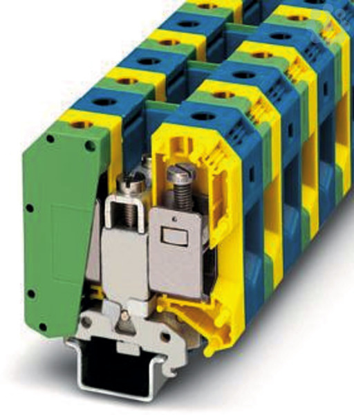 Installations-Schutzleiterklemme, PE/N-Block, bestehend aus einer grün-gelben Schutzleiterklemme und einer blauen Reihenklemme mit Schraubbrücke, Nennspannung: 1000 V, Nennstrom: 150 A, Schraubanschluss, Bemessungsquerschnitt: 50 mm², Querschnitt: 16 mm² - 70 mm², Montageart: NS 35/7,5, NS 35/15, NS 32, Farbe: grün-gelb