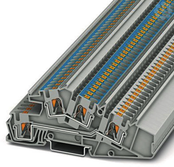 Installationsetagenklemme, Nennspannung: 400 V, Nennstrom: 28 A, Push-in-Anschluss, 1., 2. und 3. Etage, Bemessungsquerschnitt: 4 mm², Querschnitt: 0,2 mm² - 6 mm², Montageart: NS 35/7,5, NS 35/15, Farbe: grau