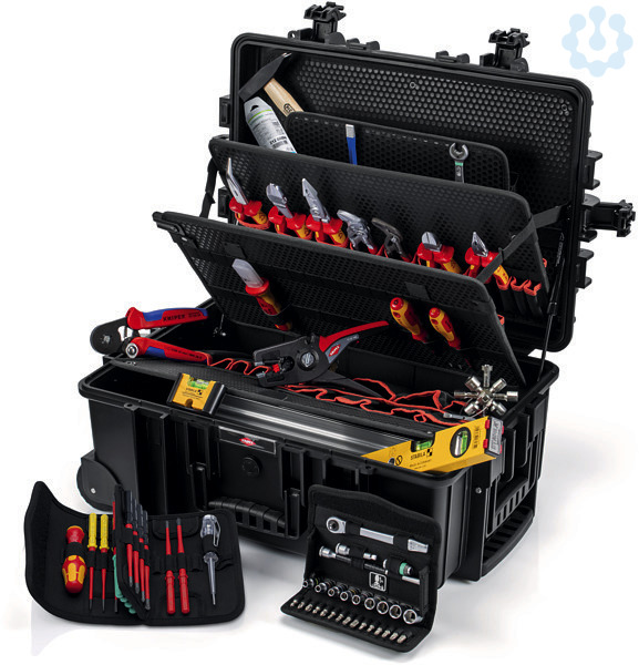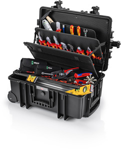 00 21 37 Werkzeugkoffer Robust45 Move Elektro Umfangreich bestückt mit 63 Markenwerkzeugen, teilweise VDE-geprüft nach DIN EN 60900. Insgesamt 147 Steckmöglichkeiten. Max. Zuladung: 35 kg. 45 Liter Fassungsvermögen. Für härteste Einsatzbedingungen: Staub-, wasserdicht und temperaturbeständig. Flugtauglicher Koffer aus schlagfestem Polypropylen. Staub- und wasserdicht. Automatisches Druckausgleichventil. Temperaturstabil von -30C bis +80C. Vorrichtung für Vorhängeschloss. Dokumentenfach. Werkzeugtafeln aus schmutzabweisenden PP-Hohlkammerplatten mit bestückbaren Werkzeugtaschen und -schlaufen. Verschließbare Bodenschale individuell unterteilbar durch Aluminium-Trennstegesystem. Ergonomischer Zweikomponenten-Griff. Gasdruckdämpfer im Scharnier. Pneumatisch gedämpfter Deckel. Ausziehbarer Teleskopgriff für komfortablen Transport. Große leichtgängige Rollen. Abmessungen, außen (B x H x T): 609 x 428 x 263 mm Abmessungen, innen (B x H x T): 540 x 364 x 229 mm. - Abmessung Breite außen (innen): 609mm 540mm - Abmessung Höhe außen (innen): 263mm 229mm - Abmessung Tiefe außen (innen): 428mm 364mm Lieferumfang: 1 x 00 11 01 Knipex TwinKey Schaltschrankschlüssel der Standard Schaltschrankschlüssel (92 mm), 1 x 86 03 180 KNIPEX Zangenschlüssel Zange und Schraubenschlüssel in einem Werkzeug (180 mm), 1 x 98 52 KNIPEX Kabelmesser (190 mm), 1 x 97 53 04 KNIPEX Selbsteinstellende Crimpzange für Aderendhülsen mit Seiteneinführung (0,08 – 10 + 16 mm²), 1 x 08 26 145 KNIPEX Spitz-Kombizange (145 mm), 1 x 87 01 180 Knipex Cobra Hightech-Wasserpumpenzange (180 mm), 1 x 98 25 01 SL KNIPEX Schraubendreher (Slim) für Kreuzschlitzschrauben Pozidriv (PZ1 x 80 mm), 1 x 98 20 35 SL KNIPEX Schraubendreher (Slim) für Schlitzschrauben (0,6 x 3,5 x 100 mm), 1 x 13 86 200 KNIPEX Elektro-Installationszange (Ø 15 mm / 50 mm²), 1 x 16 95 01 SB KNIPEX ErgoStrip Universal-Abmantelungswerkzeug für Rechtshänder (Ø 8,0 – 13,0 mm), 1 x 70 06 160 Knipex Seitenschneider (160 mm), 1 x 26 26 200 Knipex Flachrundzange mit Schneide (Storchschnabelzange) (200 mm), 1 x 004018 Wera Zyklop Metal-Knarrensatz 8100 SA 8 28-teilig (1/4), 1 x 003760 Wera Joker Doppelmaulschlüssel (10 x 13 mm), 1 x 003484 Wera Kraftform Kompakt VDE 16 Slim, 1 x 0030312-0300 Picard Schlosserhammer (300 g), 1 x 9R 212 00096 Rennsteig , 1 x 361 252 1 Rennsteig Elektrikermeißel (250 x 10 mm), 1 x 16135 Stabila Wasserwaage Typ 70 Electric (430 mm), 1 x 18115 Stabila Mini-Wasserwaage Pocket Electric (68 mm), 1 x 12 52 195 SB KNIPEX PreciStrip16 Automatische Abisolierzange (0,08 - 16 mm²), 1 x 74 06 200 Knipex Kraft-Seitenschneider (200 mm),.