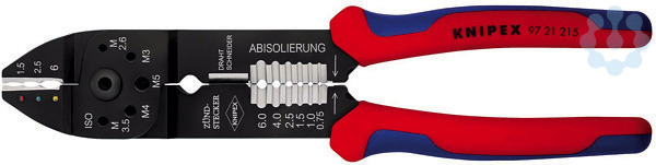 97 21 215 Crimpzange Zum Kabelschneiden, Abisolieren von Adern und Crimpen von isolierten Kabelschuhen und isolierten Schrumpfschlauchverbindern. Mit Gewindelöchern zum Abschneiden von Cu- oder Ms-Gewindestiften mit M 2,6. M 3. M 3,5. M 4 und M 5. Geschraubtes Gelenk für eine hohe Stabilität und gleichmäßigen Lauf. - Anwendung: isolierte Kabelschuhe + Kabelverbinder - Kapazität Quadratmillimeter: 0,5 — 6,0mm² - Anzahl der Nester: 3 - AWG: 20 — 10.