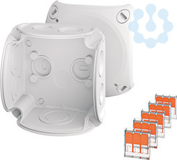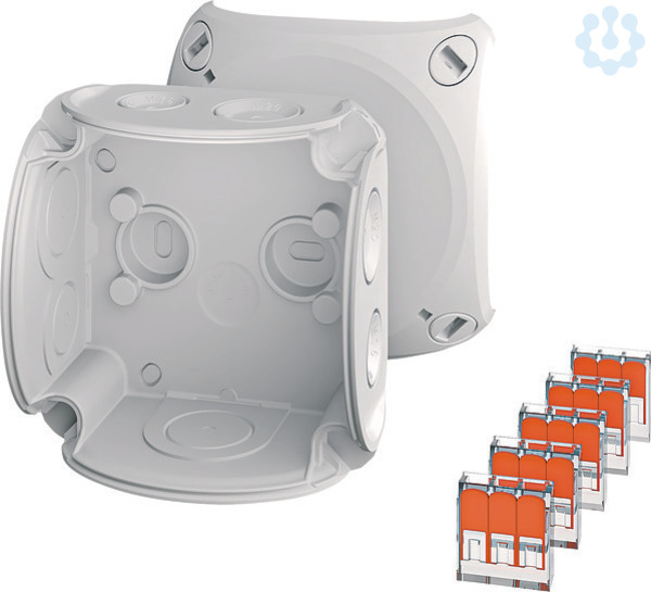 Kabelabzweigkasten aus hochwertigem Thermoplast. Für Aufputz-Anwendungen in Gebäuden oder die geschützte Installation im Freien. Mit Außenlaschen zur Befestigung und Deckelbefestigung über Schnellverschlüsse. Mit Wago-Compact-Verbindungsklemme 221-413 und Befestigungsadaptern. Kabeleinführung über elastische Dichtmembranen in Gehäusewänden und Boden. Nachträglicher Einsatz von Kabelstutzen durch Entfernen der Dichtmembrane möglich.