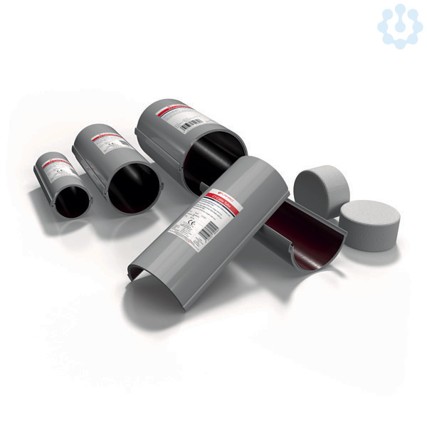 Besonders leicht zu installierende Abschottung aus zwei Rohrhalbschalen, intumeszierendem Inlay sowie zwei Abschlussstopfen