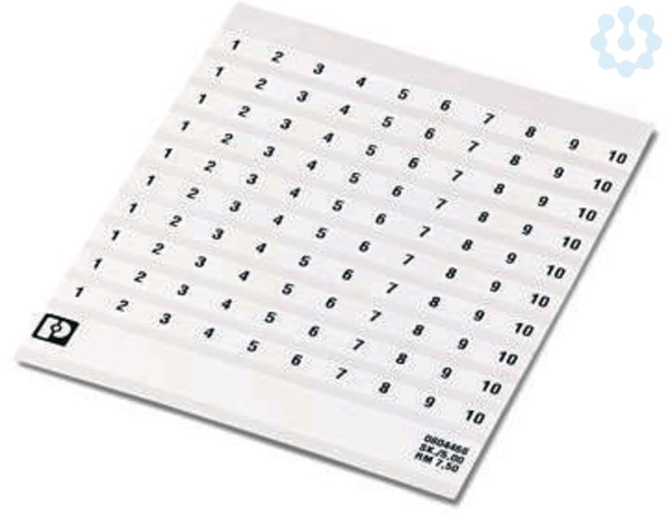 Kennzeichnungskarte, selbstklebend, bedruckt mit den fortlaufenden Zahlen: 1 ... 10, 10-teiliger Kennzeichnungsstreifen mit 10 gleichen Dekaden, weiß, für Klemmenbreite: 7,5 mm
