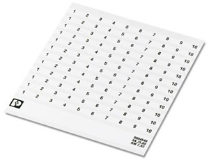 Kennzeichnungskarte, selbstklebend, längs bedruckt mit den fortlaufenden Zahlen: 1 ... 10, 10-teiliger Kennzeichnungsstreifen mit 12 gleichen Dekaden, weiß, für Klemmenbreite: 7,62 mm