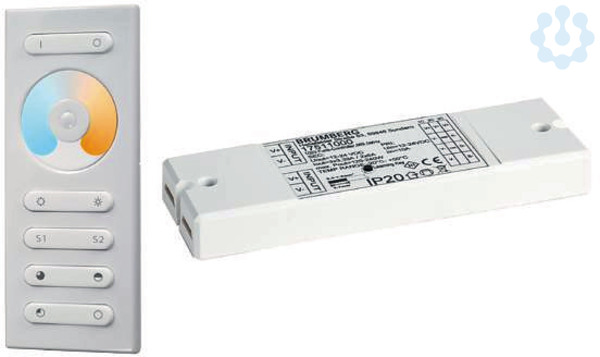 TunableWhite-Funksteuerung, weiß. TunableWhite-Funksteuerung zur Ansteuerung von zweifarbigen LED-Modulen im Weißlichtbereich. Controller: Spannung: 12-24 V DC, Strom: max. 2 x 5 A, Leistung: max. 120 W / 240 W (12 V DC / 24 V DC), Ansteuerung: negativ (gemeinsame Anode), Steuersignal: PWM, Funkfrequenz: 869,5 MHz, Reichweite (Sichtverbindung): bis zu 20 m, Maße: L 178 x B 46 x H 18 mm, Material: Kunststoff, Lieferung: inkl. Zugentlastung, Controller pro Fernbedienung: max. 4 (bei optimaler Funkverbindung) Fernbedienung: Spannung (Batterie): 4,5 V DC - 3 x AAA (nicht im Lieferumfang), Funkfrequenz: 869,5 MHz, Sendeleistung (Ps) < 0 dBm, Reichweite (Sichtverbindung): bis zu 20 m, Maße: L 120 x B 48 x H 18 mm, Material: Kunststoff Funktionsumfang: - Ein / Aus - Lichtfarbwechsel über Touchwheel - Dimmung der eingestellten Lichtfarbe - Speichertasten S1 / S2 - Wahltasten 25 % / 50 % / 75 % / 100 % Helligkeit Schutzart raumseitig: nach DIN EN 60529: IP20, Schutzklasse: (EN 61140) III, Spannung: 12V 24V, Leistung: 240 W, Art der Dimmung: Funksteuerung.