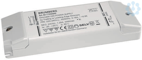 LED-Netzgerät 24 V DC, dimmbar, weiß, rechteckig. Material: Kunststoff, Schutzart raumseitig: nach DIN EN 60529: IP20, Schutzklasse: (EN 61140) II, Spannung: 24 V DC, Leistung: 30 W, Dimmbar: Ja, Art der Dimmung: Phasenabschnitt.